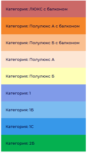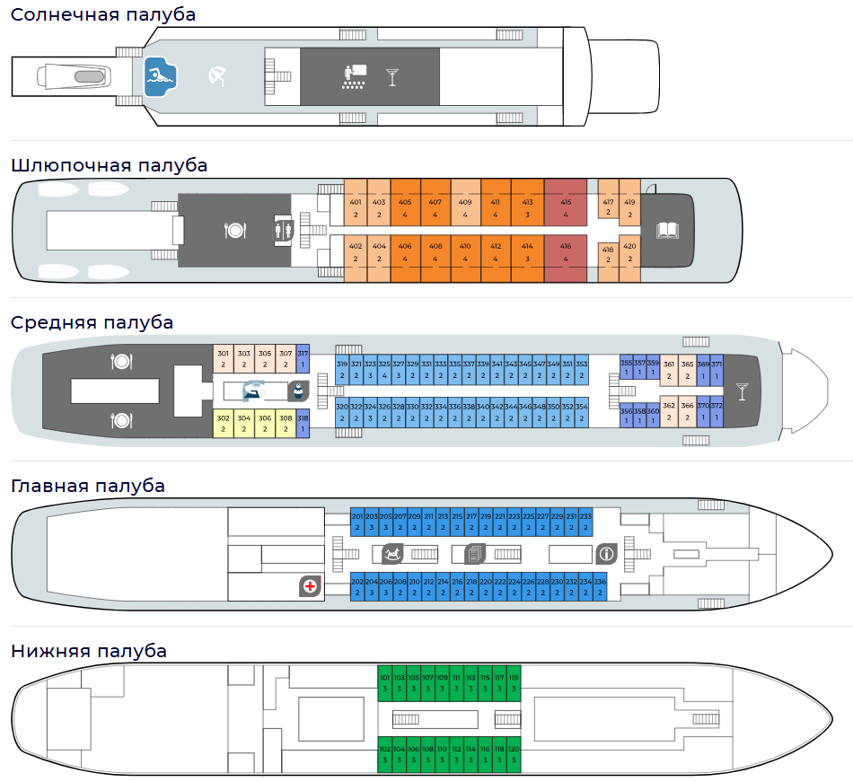 Двухместная одноярусная и трехместная, четырехместная двухъярусные каюты, расположенные на средней палубе. Площадь каюты 10 кв. м.