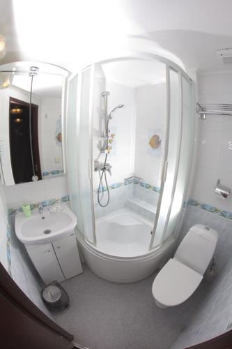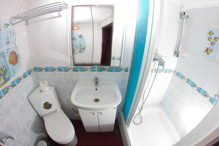 Каюты Стандарт В на нижней палубе трехместные, одноярусная и двухъярусная кровать. В каютах иллюминаторы, система кондиционирования, холодильник, шкаф, тумба, светильники прикроватные, графин с двумя стаканами, радио, розетка. Туалетная комната с душевой кабиной, раковина (набор шампунь, гель для душа, мыло).