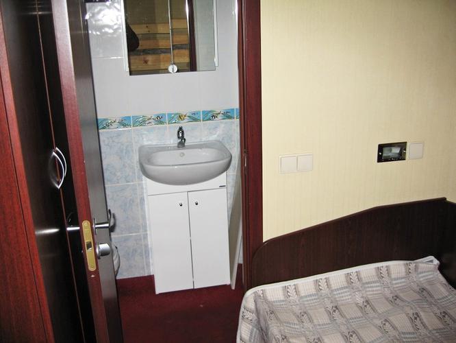 Каюты Single на средней палубе одноместные с односпальной кроватью. В каютах окно, система кондиционирования, холодильник, шкаф, тумба, светильник прикроватный, графин со стаканом, радио, розетка. Туалетная комната с душевой кабиной, раковина (набор шампунь, гель для душа, мыло).